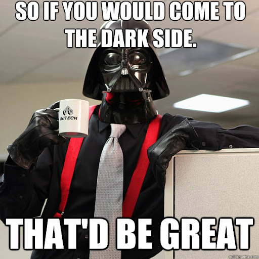 “I have a very fun-loving office. So for Halloween last year I dressed as Darth Vader and planned to enter my meetings with his theme music playing. So I went to our meeting room, threw open the door, and marched in with this loud dramatic music.