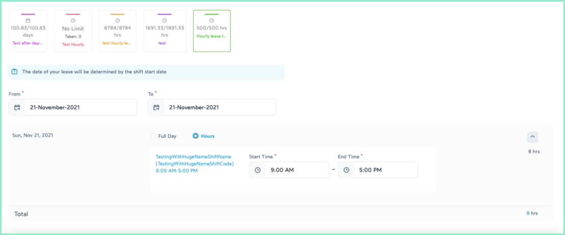 Select the option as Hours if you want to take a partial leave. Mention the start and end time, for which you would like to take leave and click on Apply.